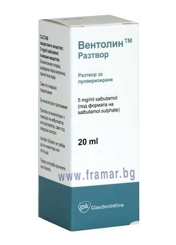 салбутамол salbutamol Прочетете внимателно цялата листовка преди да започнете да използвате това лекарство тъй като тя съдържа важна за Вас информация. Вентолин Разтвор трябва да се прилага само инхалаторно и трябва да бъде вдишван през устата. 05-10 ml Ventolin Solution 25-50 mg салбутамол се разреждат с физиологичен разтвор до краен обем от 20 или 25 ml.